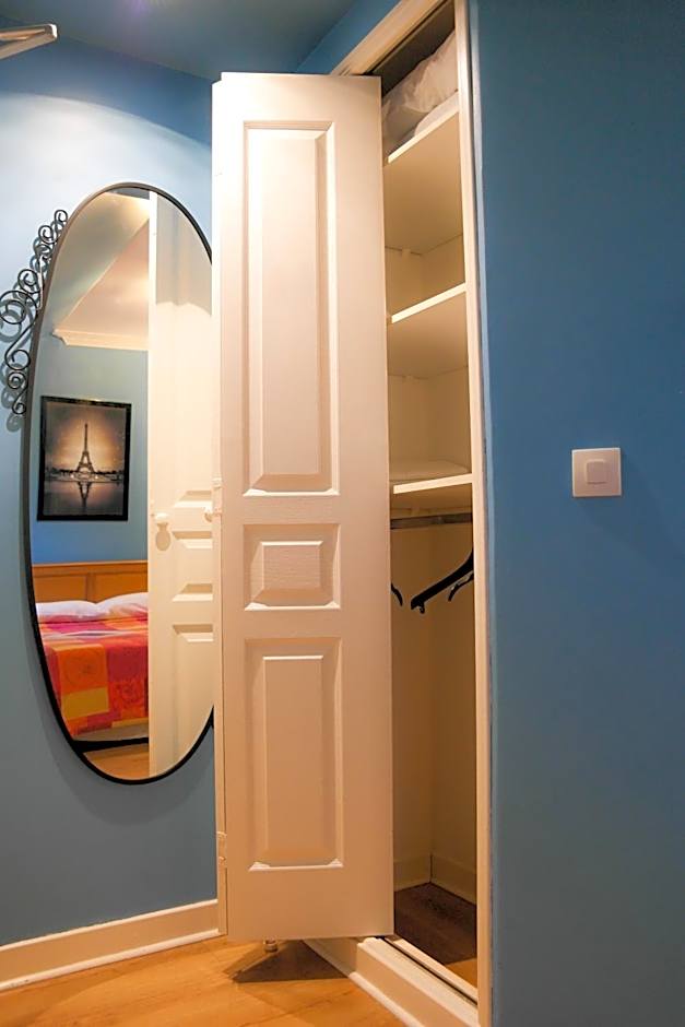 A TV, air conditioning ,safe and private bathroom feature in this room.